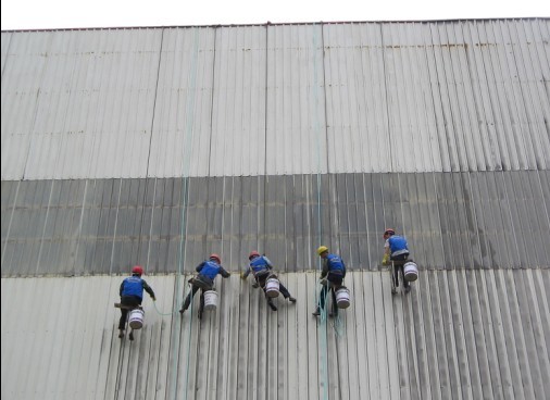 一、高空外墻常用清洗方法1、事前準(zhǔn)備工作(1)根據(jù)墻面材質(zhì)及臟污程度,確定相應(yīng)的清潔劑和工具。必要時(shí)應(yīng)作小塊清洗試驗(yàn)。(2)弄清屋頂狀況,確定水源、電源。(3)制定整體作業(yè)方案。注意事項(xiàng):屋頂和地面都要確保有人監(jiān)護(hù),并用步話機(jī)保持聯(lián)系。2.安裝運(yùn)載外墻清洗設(shè)備、工具及專用清潔劑,包括高壓沖洗機(jī)一臺(tái),膠皮管、水桶、毛滾、膠刮、毛巾、刮刀以及清潔劑、溶劑等。3.將高壓沖洗機(jī)接上電源、水源、裝好沖洗膠管,檢查好水槍效果。4.作業(yè)人員穿上雨褲,攜帶工具、清潔劑上吊籃或吊板。有些工具應(yīng)用松緊繩栓在吊籃或吊板上,以防不小心失手落下,傷了行人。在地面上設(shè)攔護(hù)繩和安全告示牌。5.作業(yè)方式為從上到下。6.清洗方法:(1)用高壓清洗機(jī)接出的膠管或水槍沖洗墻面。(2)檢查墻面上有無粘著物等污跡,如有,先用刮刀等相應(yīng)輔助工具和溶劑除去。(3)將毛滾浸入桶中,待充分吸入清潔劑后均勻涂抹在墻面上。(4)視墻面臟污程度,用刷子、磨盤、百潔布、膠刮等擦磨,再用清水沖洗凈。(5)確認(rèn)一次應(yīng)作業(yè)范圍內(nèi)的墻面已清洗完畢,滑動(dòng)吊籃或吊板,繼續(xù)往下作業(yè)。7.全部作業(yè)完成后,收拾整理機(jī)器設(shè)備和工具,撤去地面攔護(hù)繩和告示牌,將地面水跡擦凈。